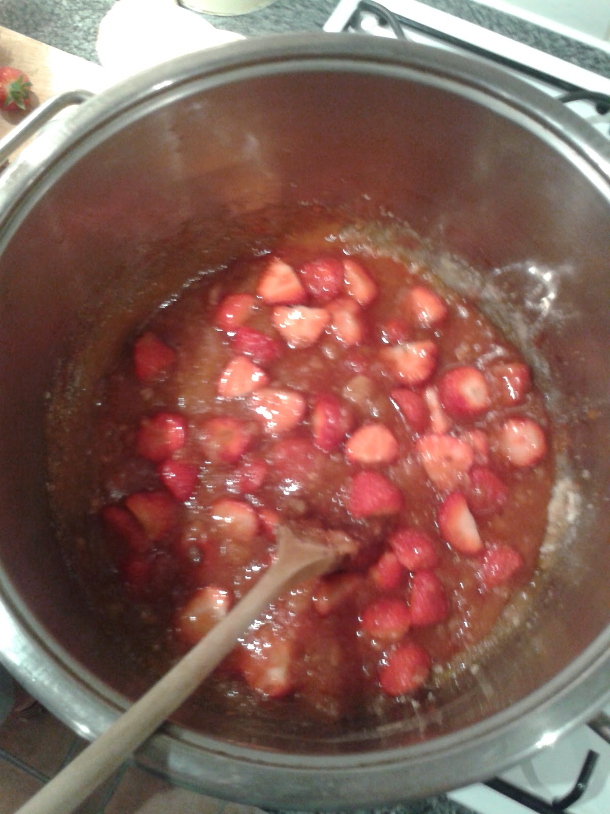 Its been a beautiful day and after sorting out the study we thought we would enjoy a lovely lunch in the garden. We followed this with lovely ripe strawberries and clotted cream icecream. There seemed to be a glut of strawberries so we decided to make the most of this harvest and as its Ashleigh's favourite we chose to make a strawberry & vanilla conserve. So berry delicious and perfect for my homemade scones. Paul returns from his golfing trip tomorrow just in time for our anniversary so I had best get cooking those scones.Strawberry & Vanilla Conserve